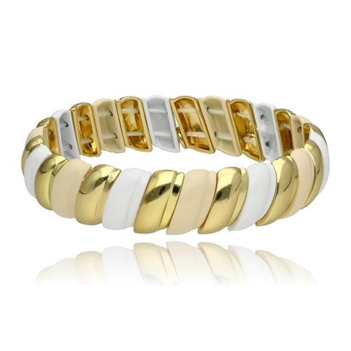 Model wykonany jest z barwnych elementów osadzonych na elastycznej gumce, dzięki czemu idealnie dopasowuje się do nadgarstka i zapewnia komfort noszenia. Można nosić ją solo lub łączyć z innymi modelami, tworząc modne, wyraziste zestawy.