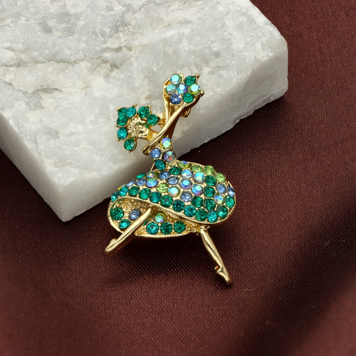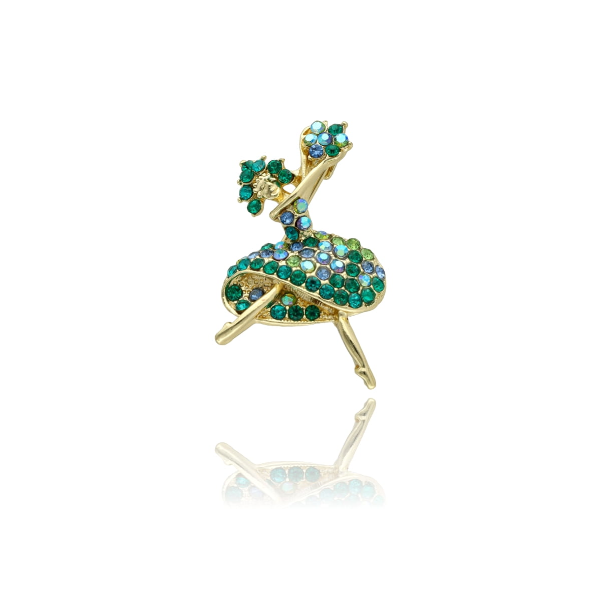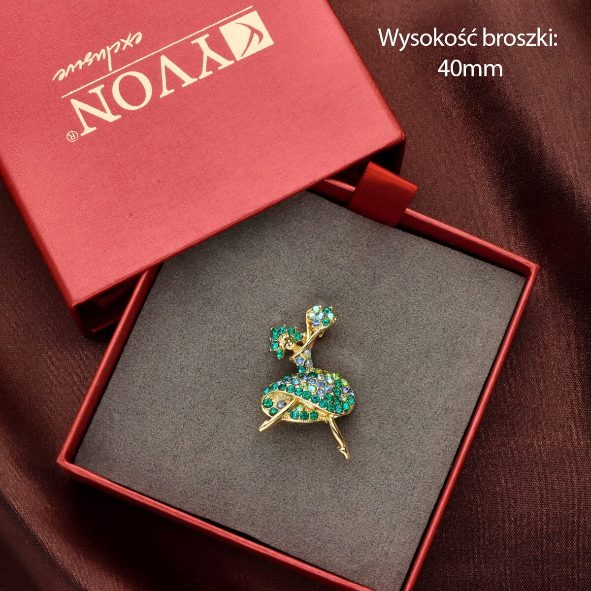 Stylowa broszka wykonana z wysokiej jakości szkła fasetowanego oraz hipoalergicznego metalu zachwyca finezyjnym kształtem baletnicy w tańcu. Jej sukienka, ozdobiona mieniącymi się kryształkami w odcieniach zieleni, turkusu i błękitu, pięknie odbija światło, tworząc zachwycający efekt głębi i ruchu. Złota oprawa dodaje całości elegancji i podkreśla biżuteryjny charakter broszki.