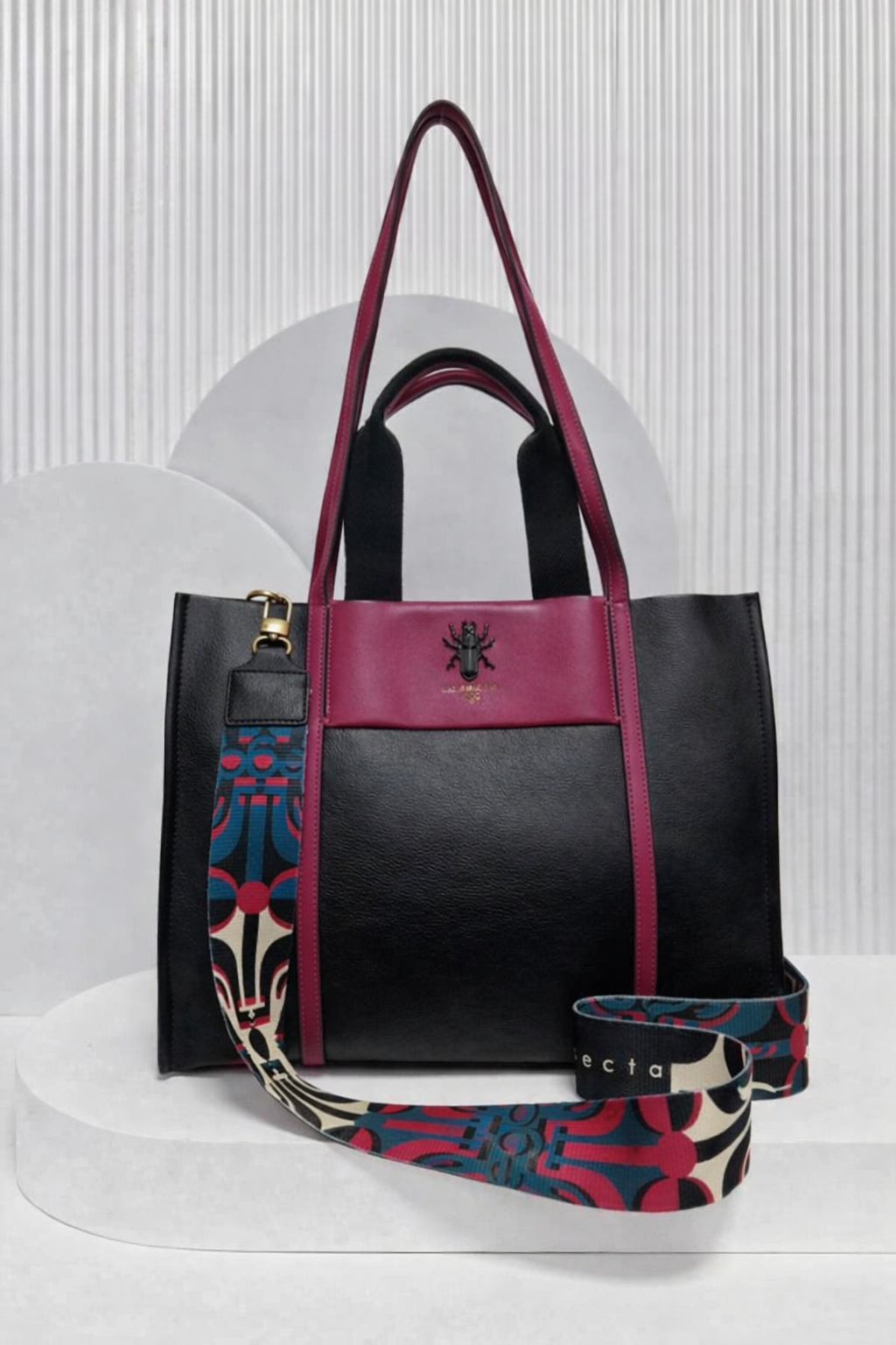 Torebka posiada wygodne, solidne rączki, umożliwiające noszenie w dłoni lub na ramieniu, a także regulowany, odpinany pasek materiałowy, dzięki któremu można nosić ją również jako torbę na ramię lub crossbody.