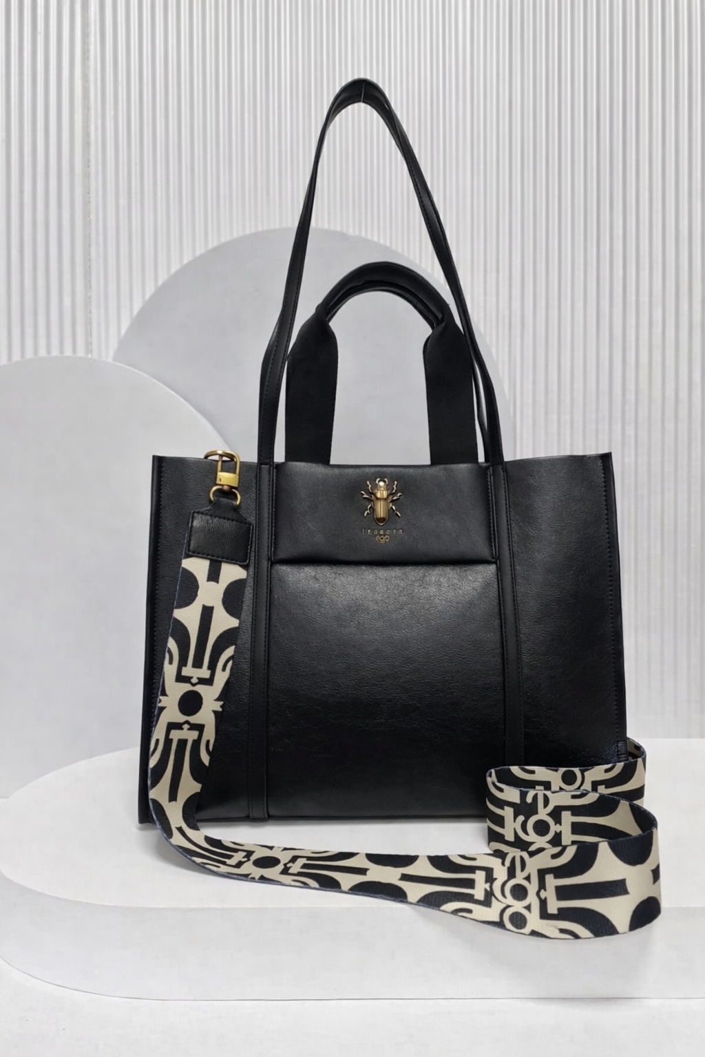 Torebka posiada wygodne, solidne rączki, umożliwiające noszenie w dłoni lub na ramieniu, a także regulowany, odpinany pasek materiałowy, dzięki któremu można nosić ją również jako torbę na ramię lub crossbody.