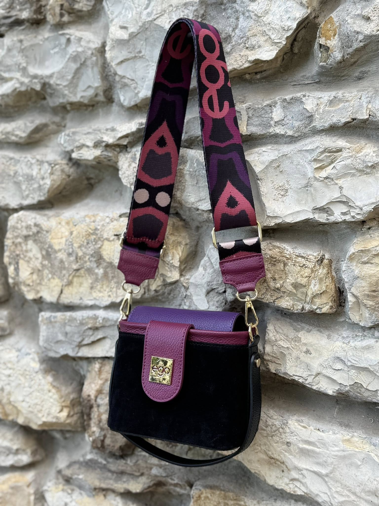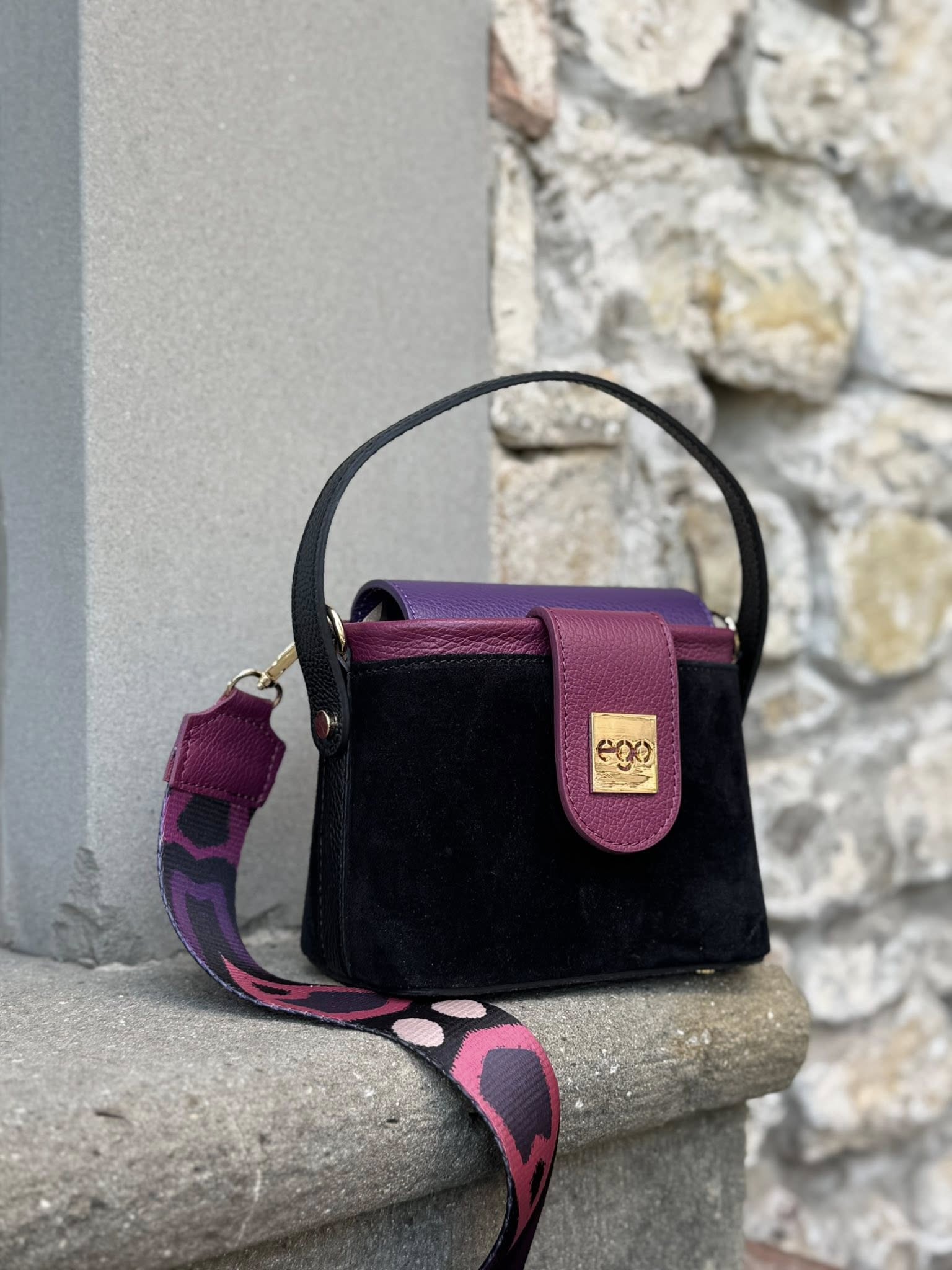 Wykonana z wysokiej jakości naturalnej skóry oraz miękkiego zamszu, torebka urzeka subtelnym kontrastem faktur i starannie dopracowanymi detalami. Charakterystyczny dla kolekcji printowany pasek nadaje jej wyjątkowego, artystycznego wyrazu.