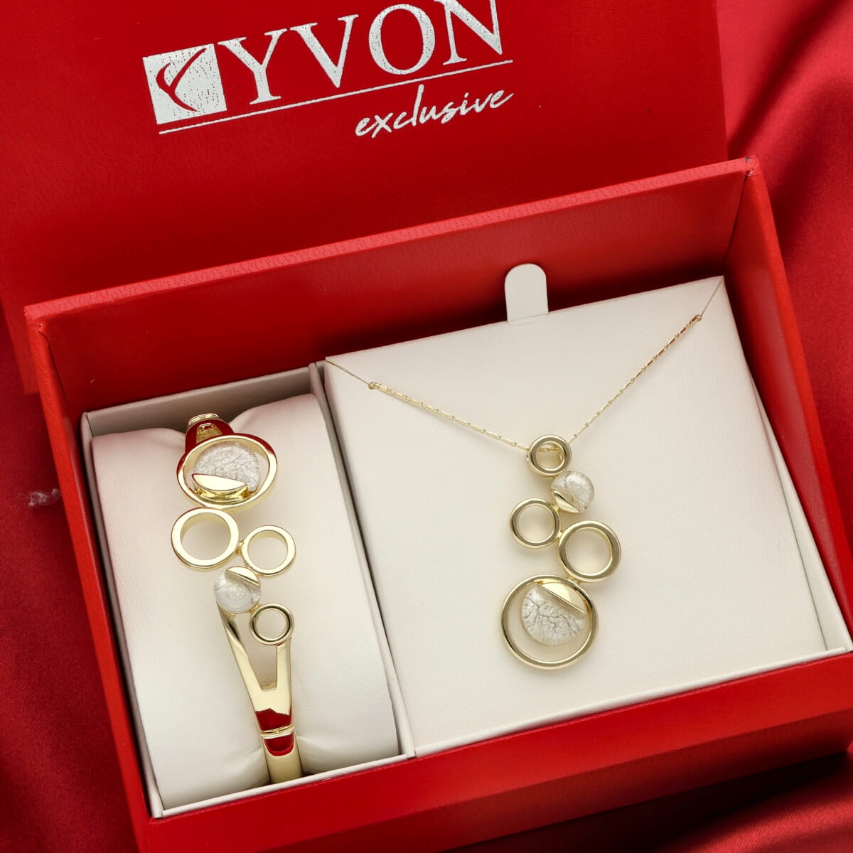 Luksusowy komplet z linii YVON Exclusive to wyjątkowe połączenie elegancji i nowoczesnego designu. W skład zestawu wchodzi efektowny naszyjnik oraz perfekcyjnie dopasowana bransoleta, tworzące spójną, harmonijną kompozycję.