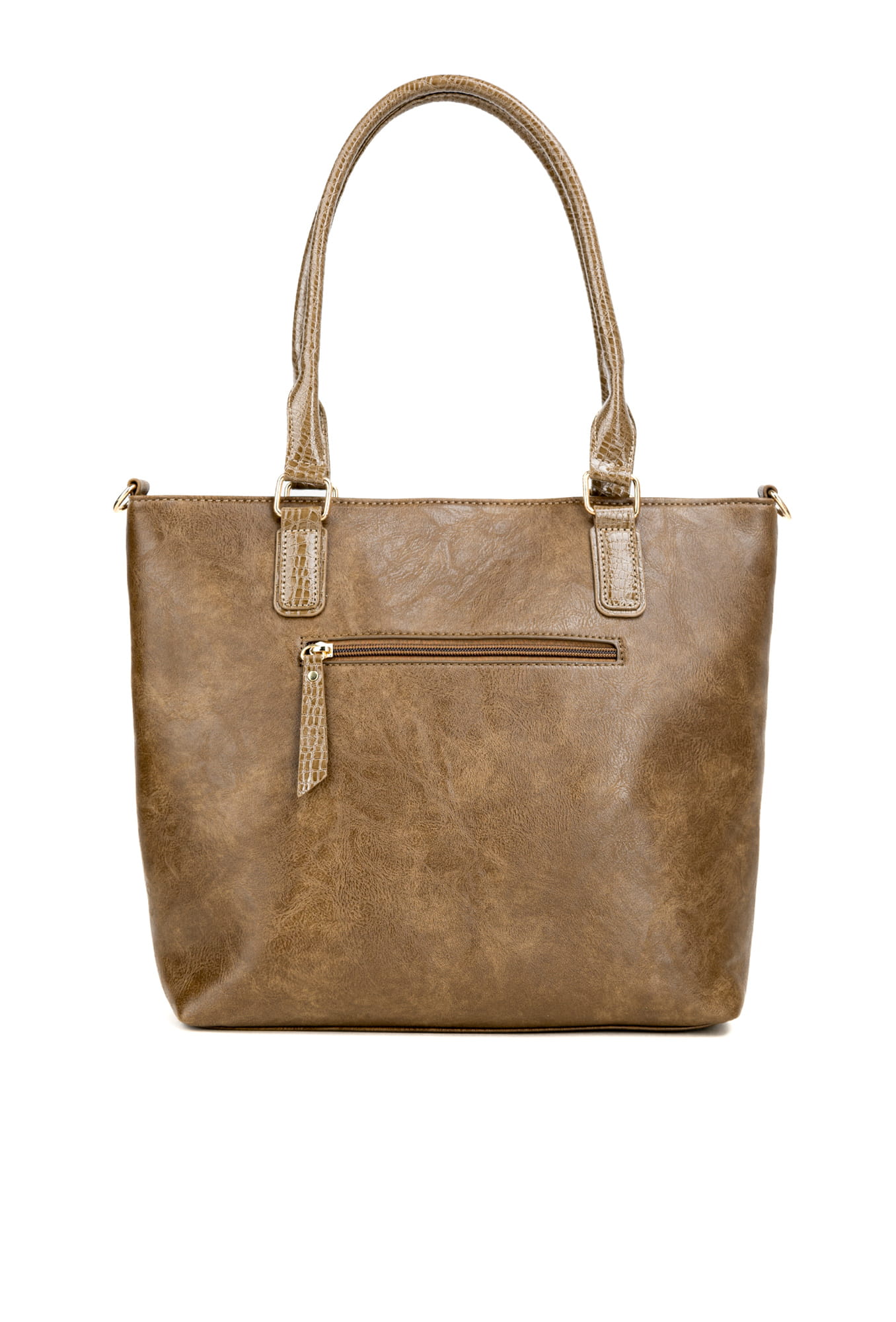 Efektowne wzornictwo – przód ozdobiony wstawkami z lakierowanej eko-skóry o fakturze krokodyla oraz subtelnym złotym logo.