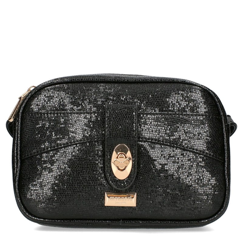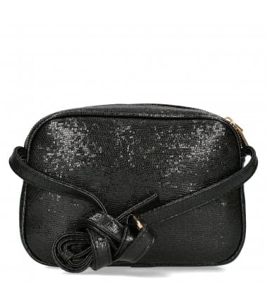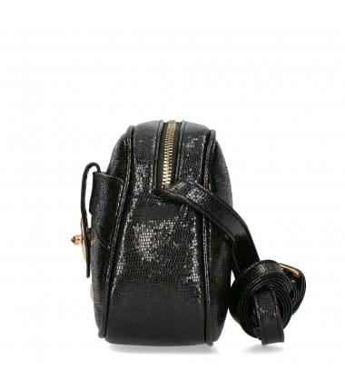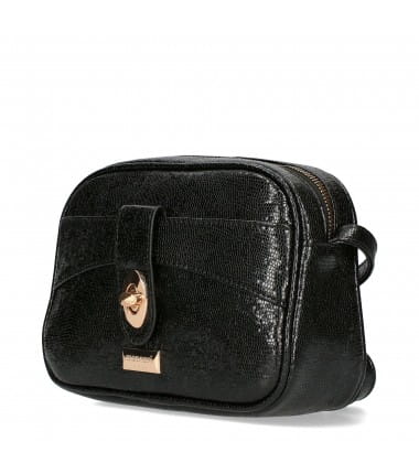 Wnętrze jednokomorowe, starannie wykończone logowaną podszewką, mieści wszystkie niezbędne drobiazgi. Na froncie znajduje się praktyczna kieszonka, idealna na telefon lub klucze. Torebka zamykana jest na zamek błyskawiczny oraz klamrę ozdobną.