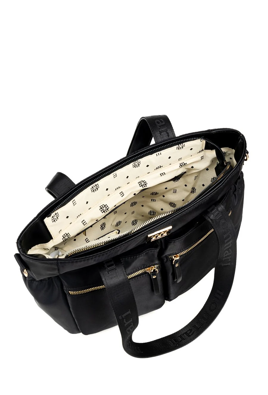 Torebka posiada jedną pojemną komorę, wykończoną jasną, logowaną podszewką, która dodaje całości lekkości i luksusowego charakteru. Wnętrze uzupełniają praktyczne kieszonki na drobiazgi, ułatwiające organizację. Na froncie znajdują się funkcjonalne kieszenie zapinane na zamek, idealne na rzeczy, które chcesz mieć zawsze pod ręką.
