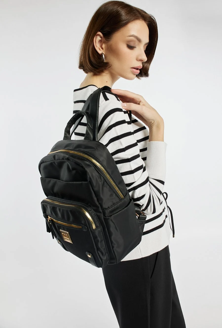 Na froncie plecaka umieszczono praktyczną kieszeń zapinaną na zamek oraz subtelne, złote logo, które podkreśla markowy i nowoczesny styl. Uniwersalny design sprawia, że plecak świetnie komponuje się zarówno z casualowymi, jak i bardziej eleganckimi stylizacjami.