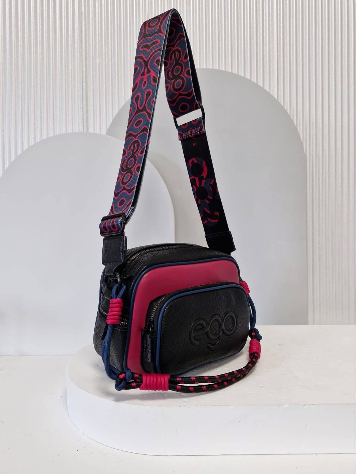 Torebka posiada jedną pojemną komorę główną, w której znajdują się trzy praktyczne kieszonki: jedna zapinana na zamek – idealna na dokumenty lub cenne drobiazgi – oraz dwie kieszonki otwarte, np. na telefon. Wnętrze wykończone jest kolorową, logowaną podszewką EGO.