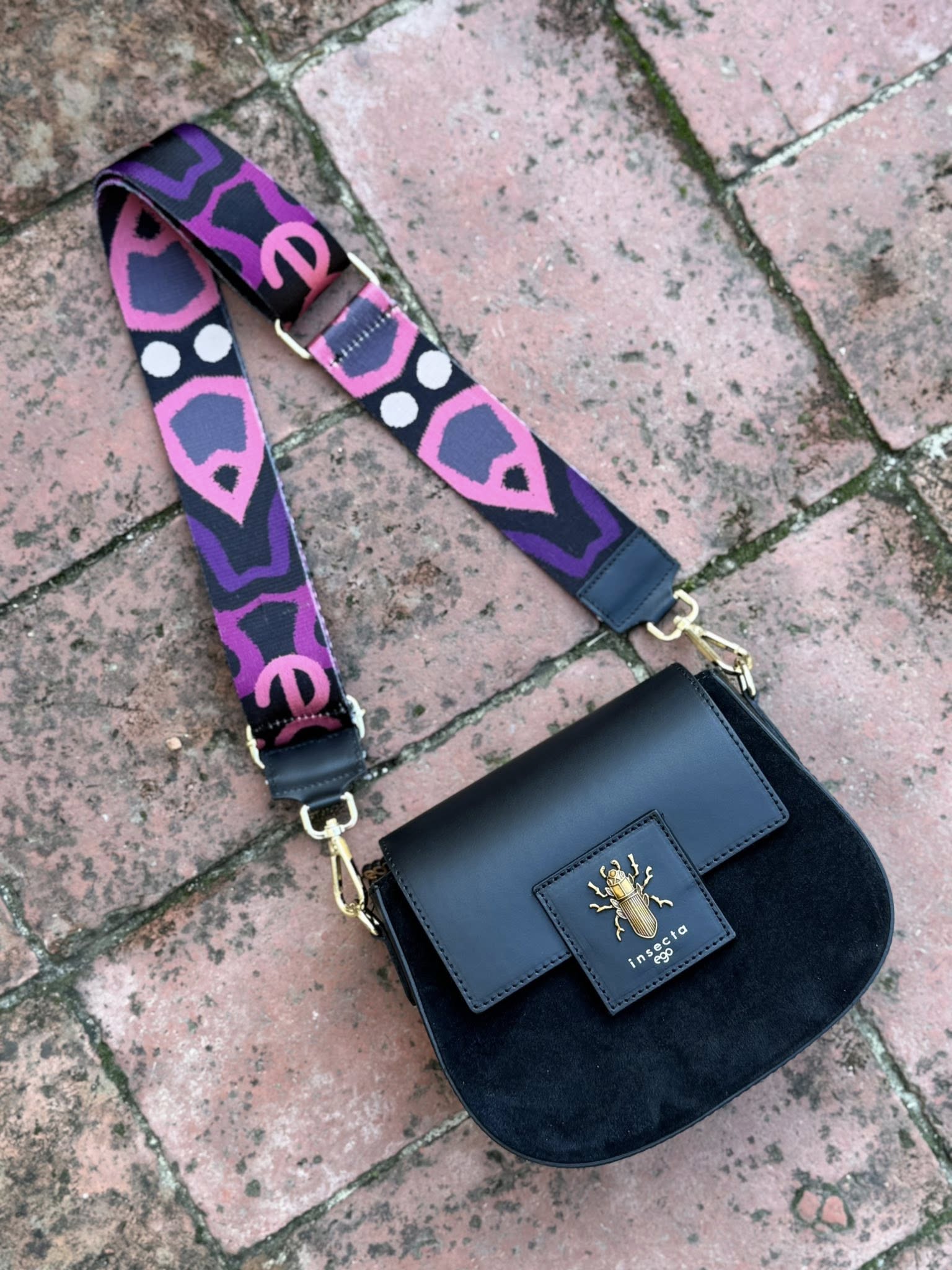 Torebka wykonana została z najwyższej jakości naturalnej skóry i miękkiego zamszu, co tworzy subtelne, ale efektowne zestawienie faktur. W zestawie znajdują się dwa paski – klasyczny, skórzany oraz printowany z motywem kolekcji Insecta, dzięki czemu możesz dopasować styl torebki do okazji lub nastroju.