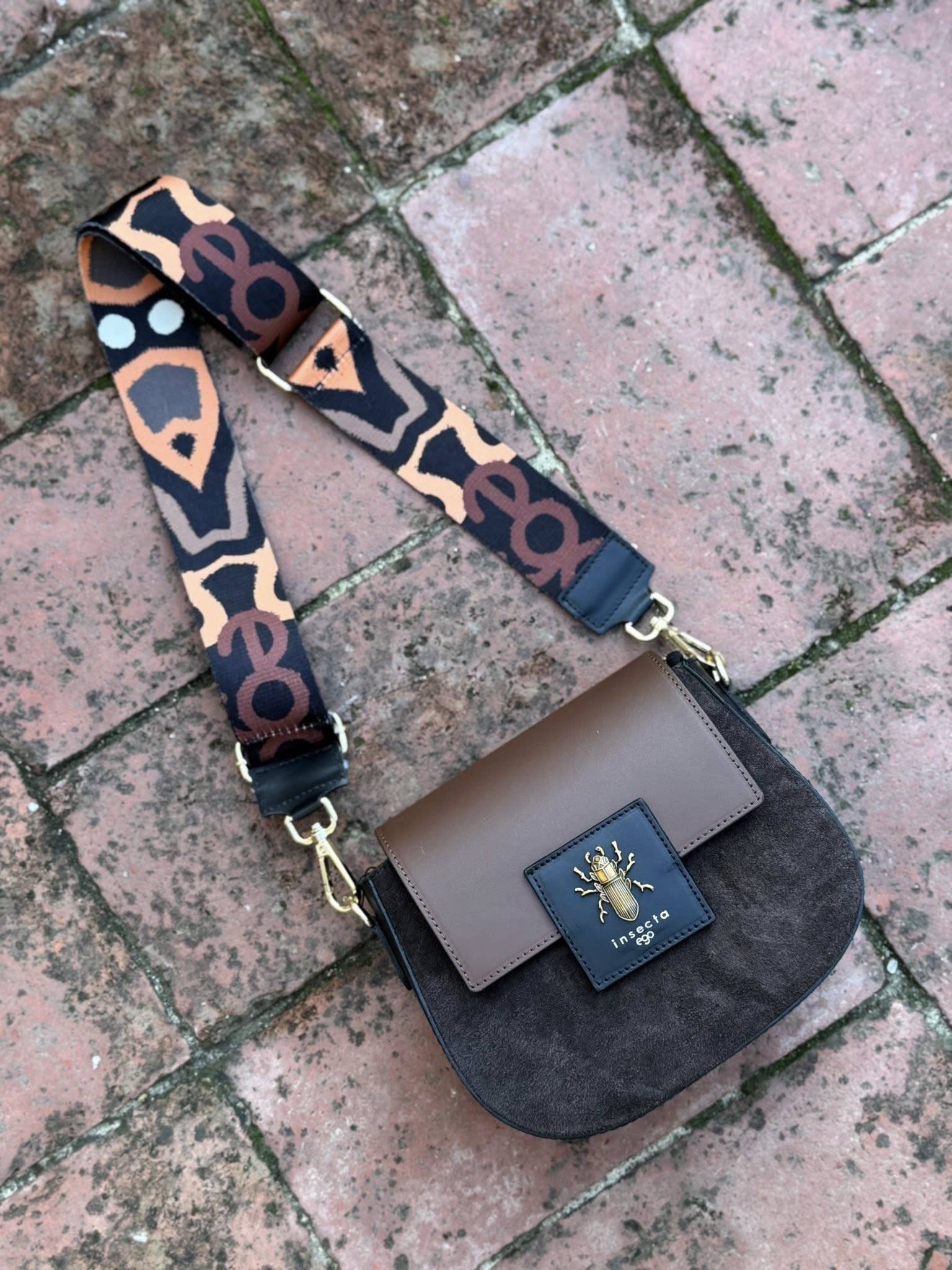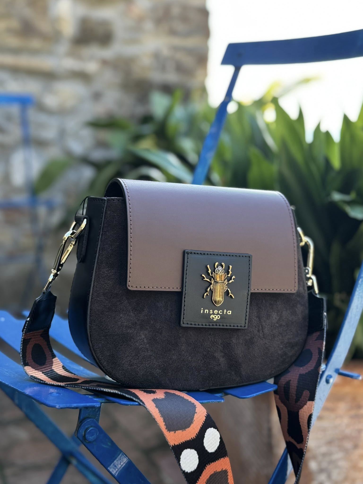 Torebka wykonana została z najwyższej jakości naturalnej skóry i miękkiego zamszu, co tworzy subtelne, ale efektowne zestawienie faktur. W zestawie znajdują się dwa paski – klasyczny, skórzany oraz printowany z motywem kolekcji Insecta, dzięki czemu możesz dopasować styl torebki do okazji lub nastroju.