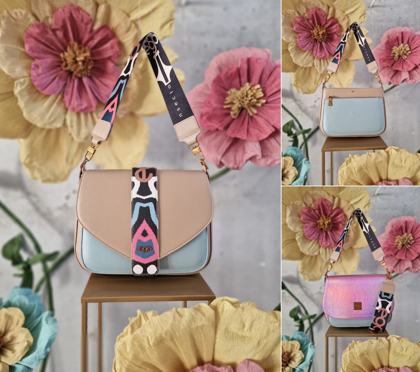 Torebka Ego TRANSFORMA wymienne klapki beż / błękit/holo róż