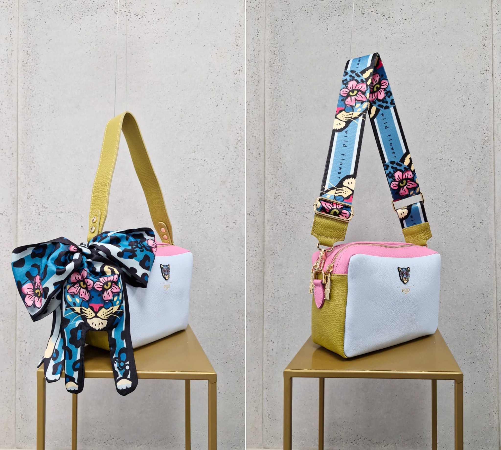 Dodatkowym elementem jest dekoracyjna apaszka, którą można nosić na wiele sposobów – przy torebce lub jako osobny akcent stylizacji.