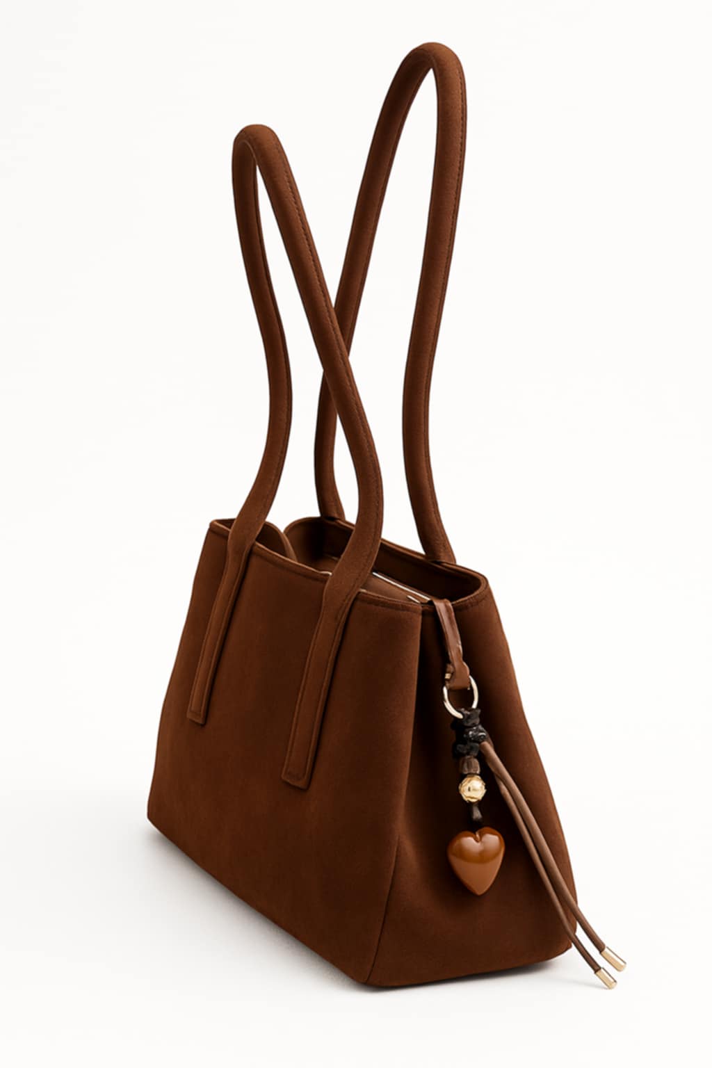 Torebka jest lekko usztywniona, dzięki czemu zachowuje swój kształt nawet bez zawartości. Długie, wygodne rączki umożliwiają komfortowe noszenie jej na ramieniu lub w dłoni. Subtelne zdobienie w postaci breloczka dodaje całości modowego charakteru.