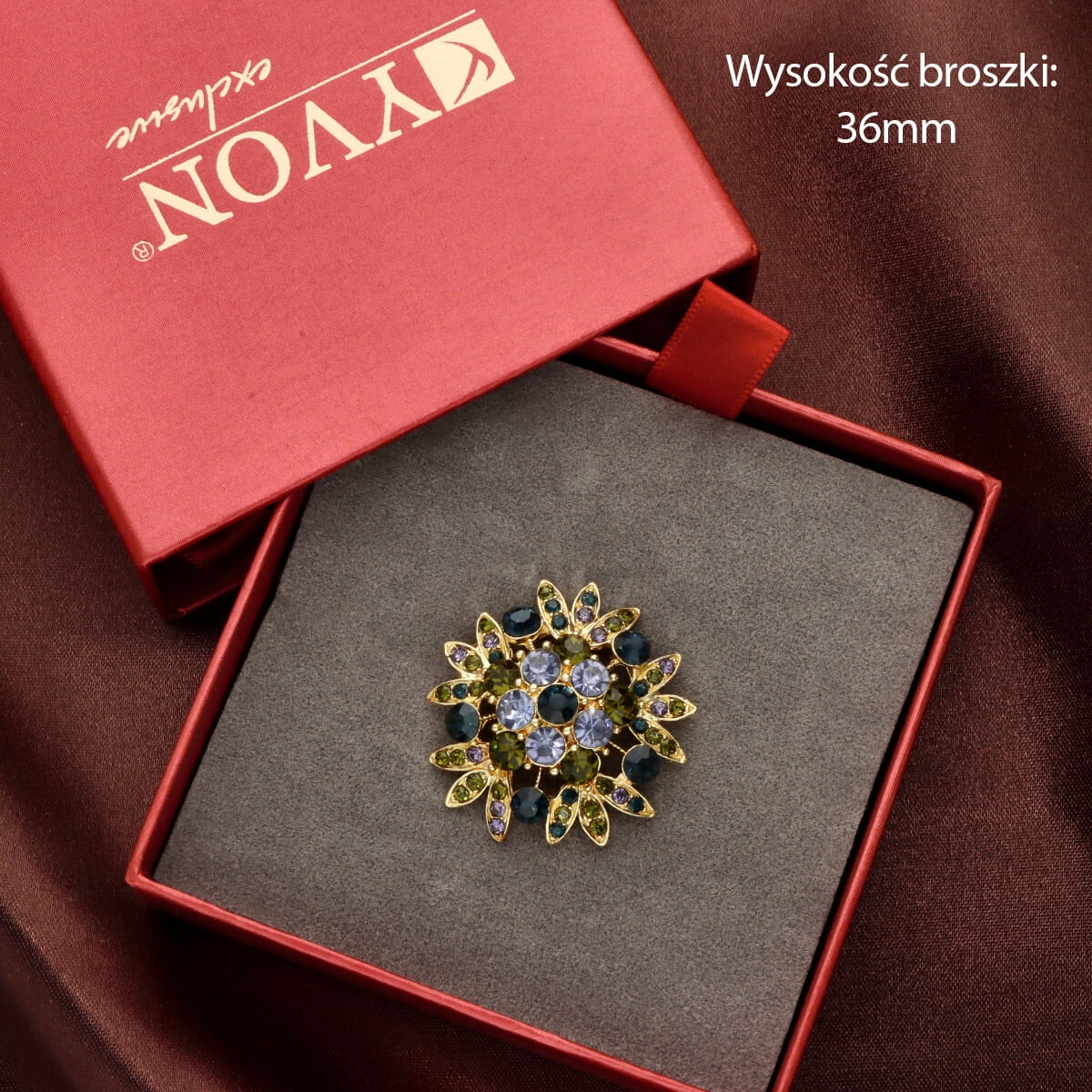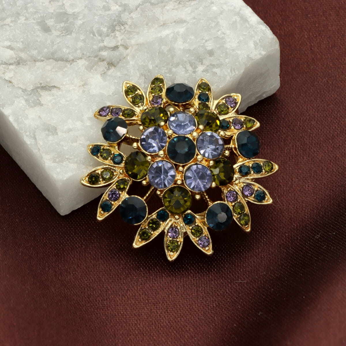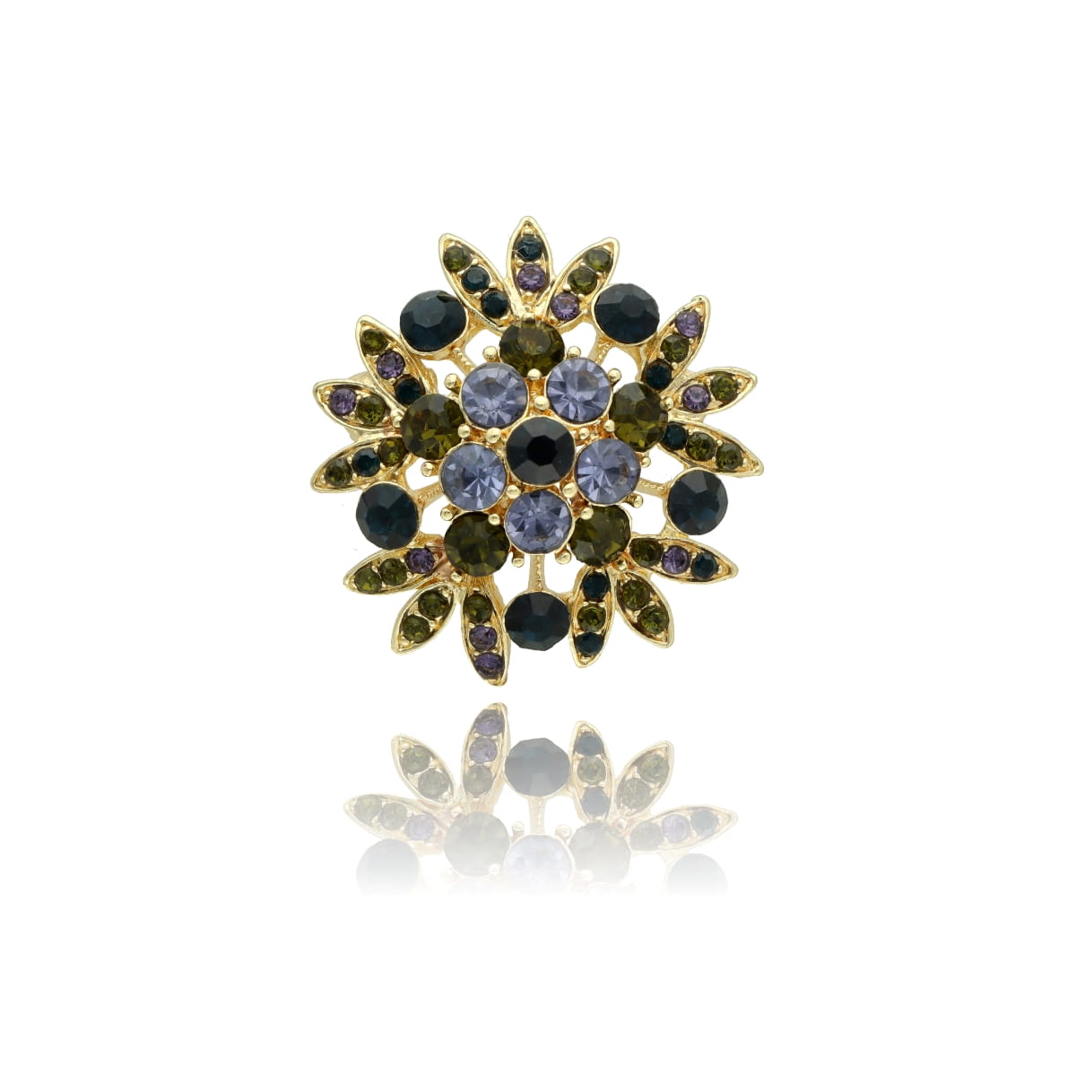 Stylowa broszka w formie kwiatowego rozety zachwyca kompozycją wysokiej jakości szkła fasetowanego, osadzonego w złotej, hipoalergicznej oprawie. Kryształki w odcieniach butelkowej zieleni, oliwki, granatu i jasnego fioletu tworzą efekt głębi i szlachetnego blasku, pięknie podkreślając jesienne stylizacje.