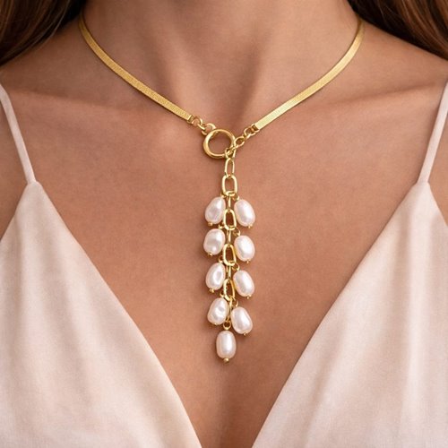 Elegancki naszyjnik z naturalnymi perłami to wyjątkowa propozycja dla kobiet, które cenią subtelną, a zarazem efektowną biżuterię. Ozdobiony nieregularnymi perłami o delikatnym połysku, pięknie podkreśla dekolt i dodaje stylizacji klasy.