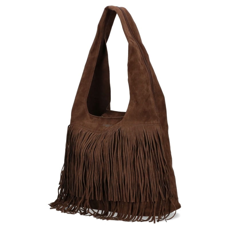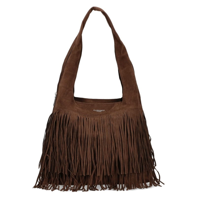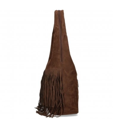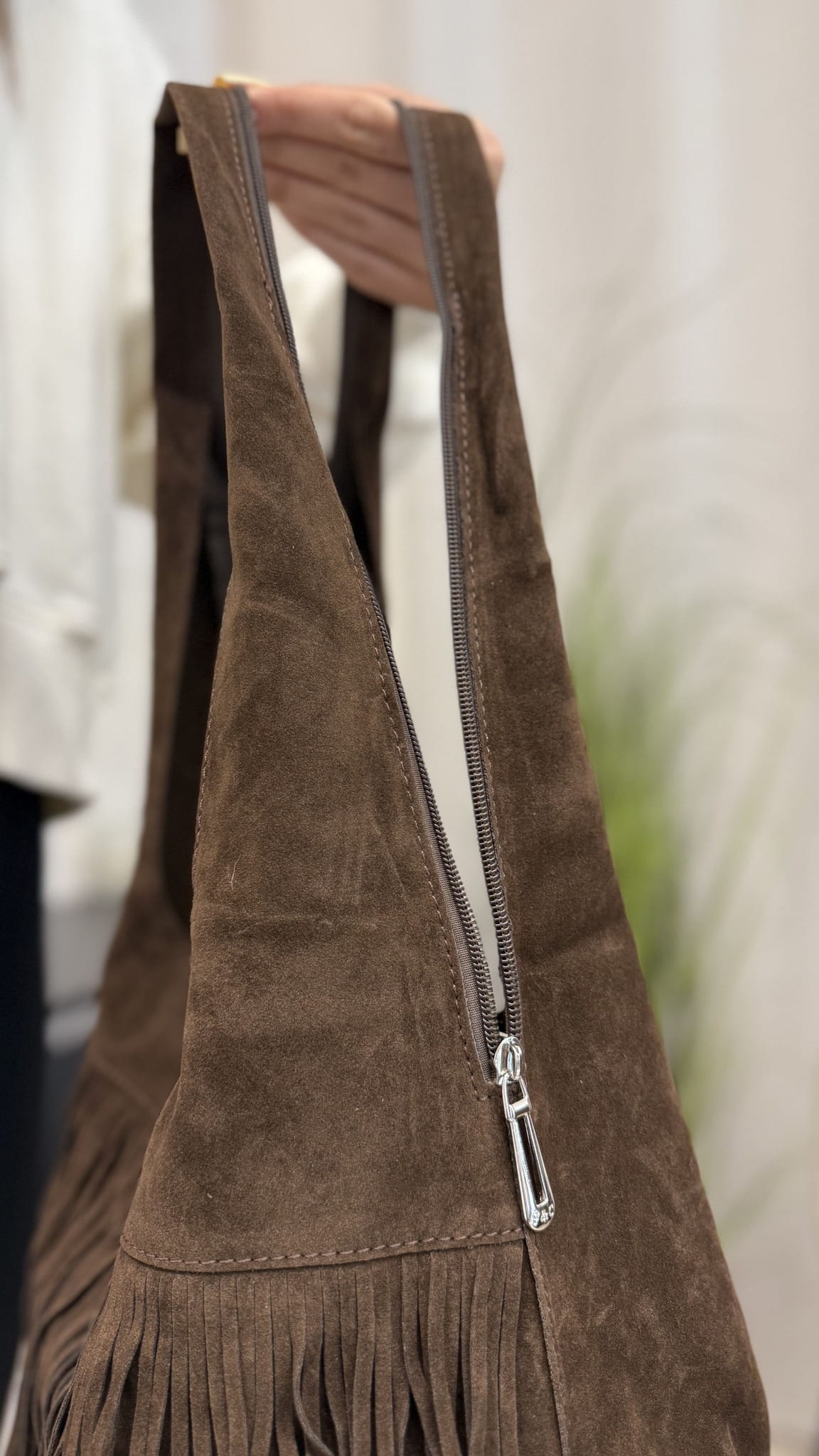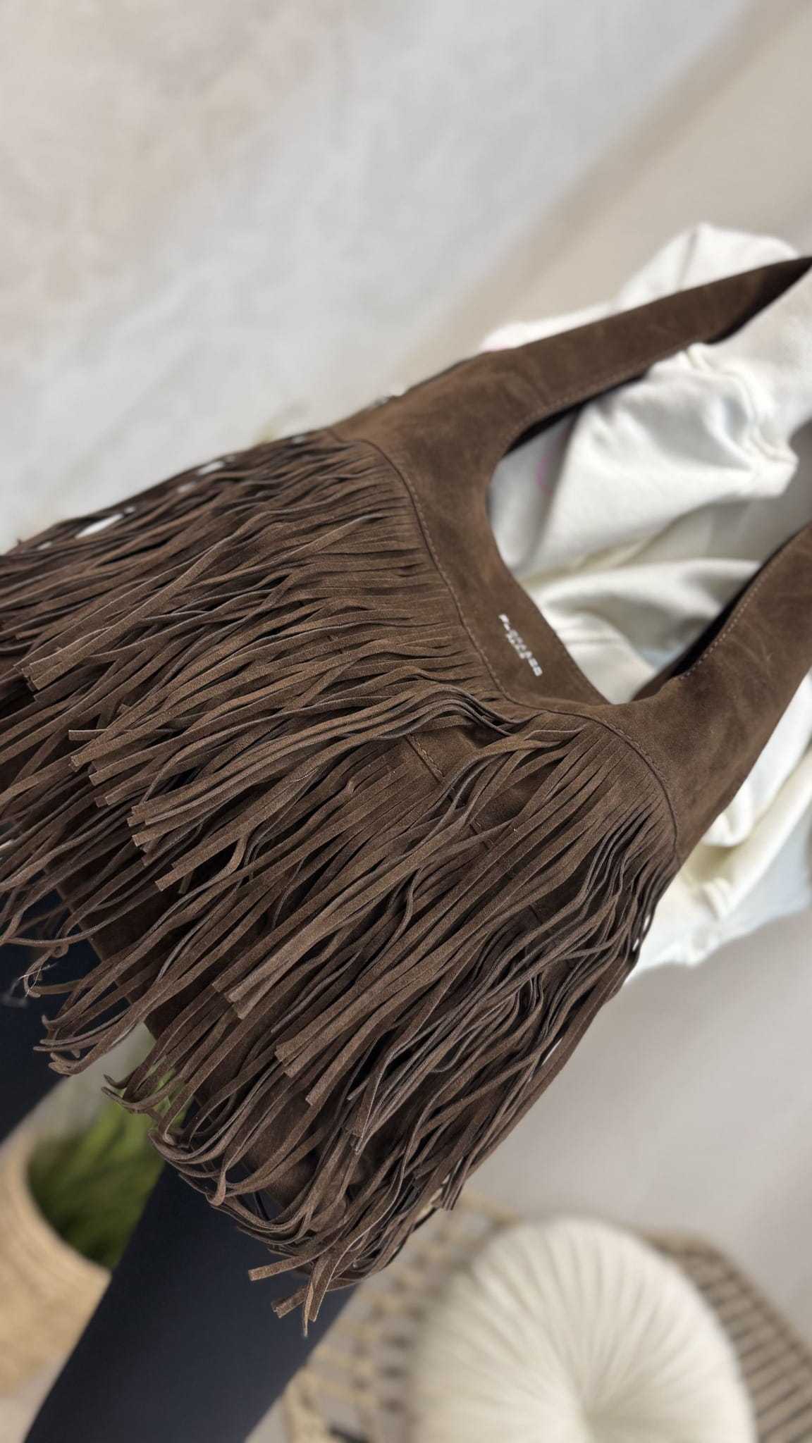 Flora & Co – zamszowy worek z frędzlami w odcieniu czekoladowego brązu