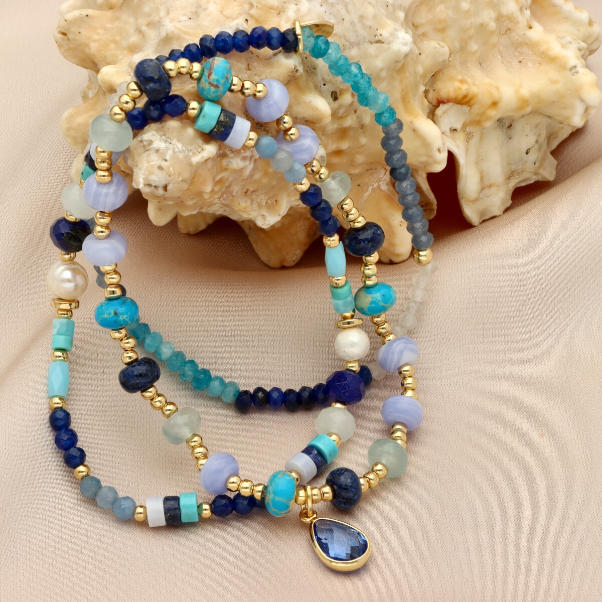 Biżuteria została wykonana z hipoalergicznego mosiądzu oraz szkła kryształowego, a całość uzupełniają starannie dobrane kamienie naturalne: awenturyn, lapis lazuli oraz perły naturalne. Subtelne detale i delikatna forma nadają zestawowi lekkości i kobiecego charakteru.