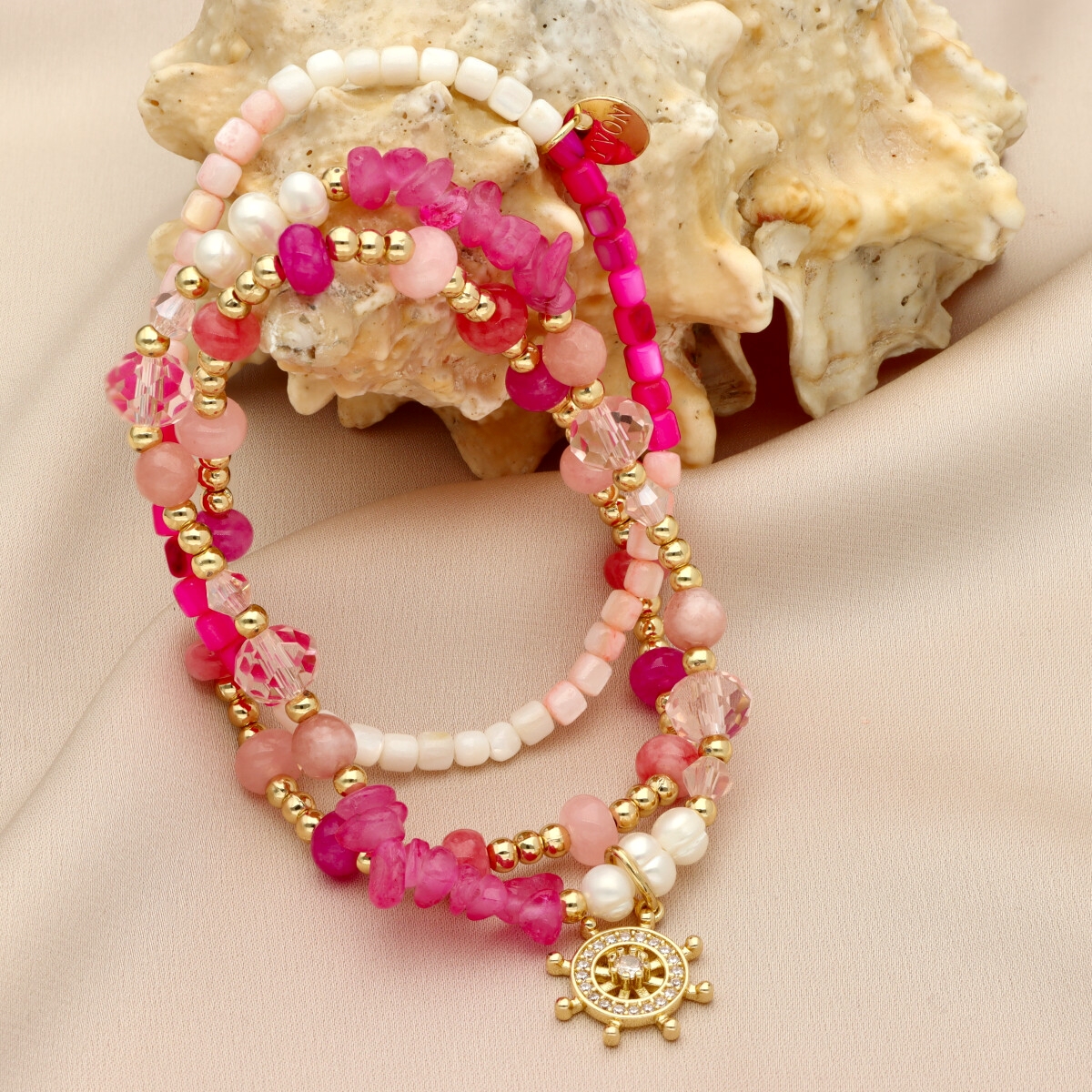 Biżuteria została wykonana z hipoalergicznego mosiądzu oraz szkła kryształowego. Całość uzupełniają naturalne elementy: marmur, rubelit, howlit, perły oraz muszla naturalna, które nadają zestawowi wyjątkowego charakteru. Ozdobna zawieszka dodaje całości elegancji i unikalnego wykończenia.