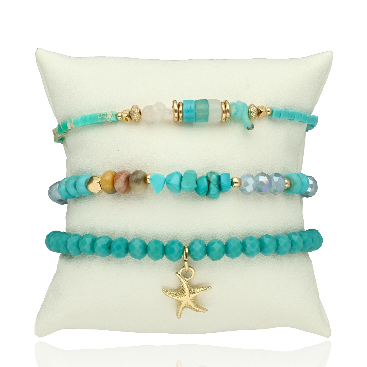 Bransoletki zostały wykonane z naturalnych kamieni – turkusu, marmuru oraz amazonitu – uzupełnionych szkłem kryształowym i elementami z hipoalergicznego mosiądzu. Ich harmonijne połączenie tworzy lekki, kobiecy komplet, który świetnie sprawdzi się zarówno na co dzień, jak i jako uzupełnienie bardziej eleganckich stylizacji.